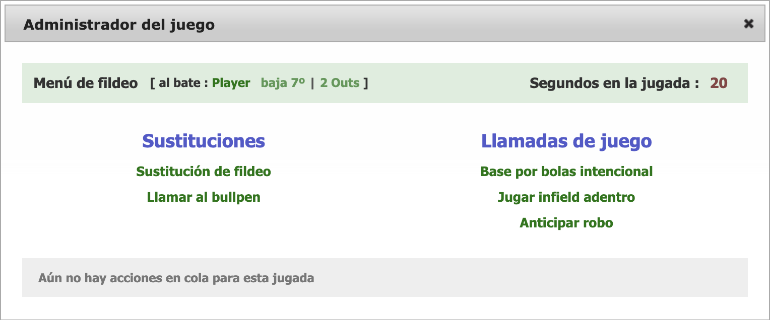 El administrador de juegos tiene dos menús: ofensivo y defensivo, dependiendo de qué equipo está en el campo y bateando. El lado izquierdo del menú corresponde a acciones de sustitución, y el derecho para acciones de juego. Dado que los juegos ocurren en tiempo real, tienes la duración de la jugada para encolar acciones para el enfrentamiento actual entre lanzador / bateador, que se ejecutarán en la siguiente jugada. Cada jugada dura 60 segundos (55 segundos para encolar, con 5 segundos después para finalizar la jugada). Una vez que encolas una acción, no puedes deshacerla. Puedes ver todas las acciones encoladas para tu jugada actual en la sección inferior del menú. Ten en cuenta que todas las acciones encoladas cancelarán cualquier condición de relevista que podría ser desencadenada para tu equipo, durante el resto del juego.