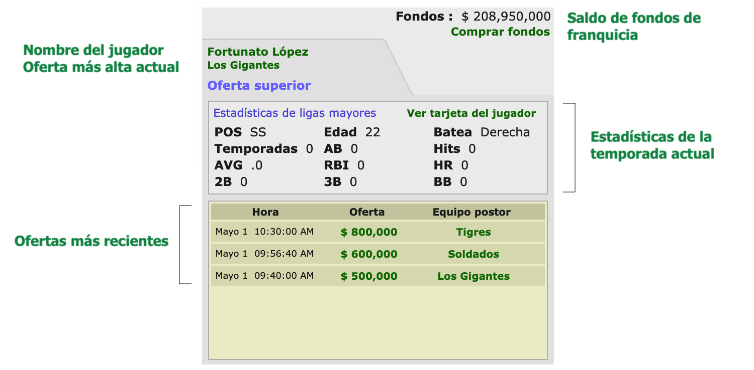 Debes pujar en incrementos de $100k. Al pujar, tus fondos se deducirán y se colocarán en reserva. Estos fondos se liberan al eliminar una puja. Sin embargo, hay una tarifa por eliminar las mejores pujas. (nota : Esta tarifa puede reducirse o incluso eliminarse mediante la actualización de tu membresía). Sin embargo, no se te cobrará una tarifa si te superan y decides aumentar o eliminar tu puja. Todas las nuevas pujas realizadas se convierten en mejores pujas. Si te superan por otra persona, tu puja seguirá vigente, pero debes liberar tu puja para recoger esos fondos reservados. Puedes mantener tu puja en su lugar si consideras que los postores superiores a ti pueden eliminar su puja más tarde. Tus fondos se devolverán al final de la temporada por cualquier jugador que no hayas ganado. Por supuesto, es posible que desees usar estos fondos para otra cosa, por lo que eliminar tus pujas por jugadores en los que ya no estás interesado suele ser una opción inteligente. Ten en cuenta que los equipos tendrán un período de gracia de 30 minutos después de la fecha límite para pujar más alto por sus propios jugadores, o para contratarlos. (Esto se conoce en el juego como la regla de los 30 minutos, que anteriormente era la regla de los 10 minutos). También ten en cuenta que las mejores ofertas no pueden eliminarse después del 15 del mes.